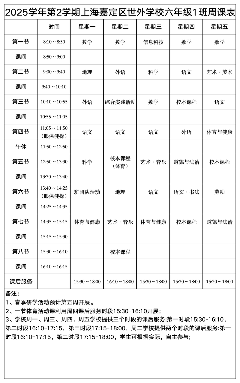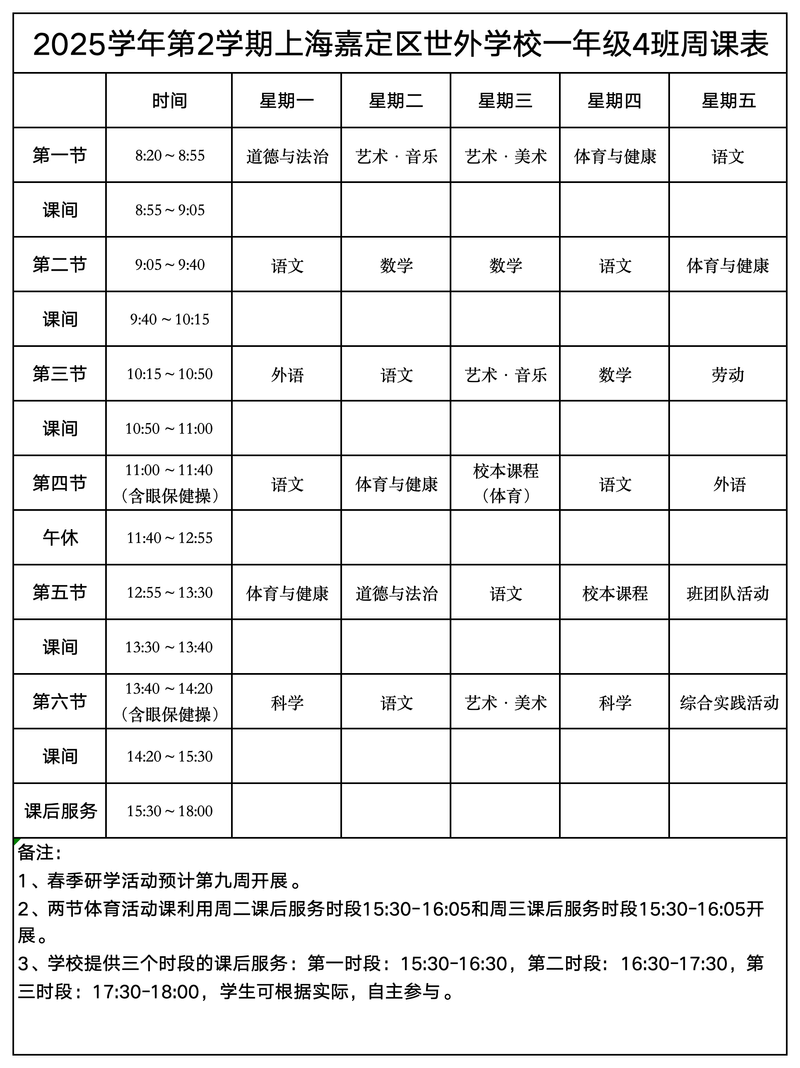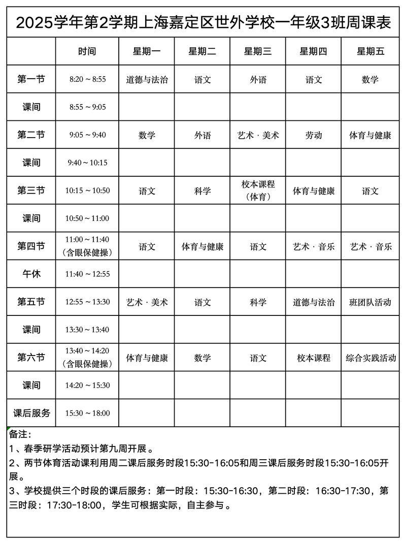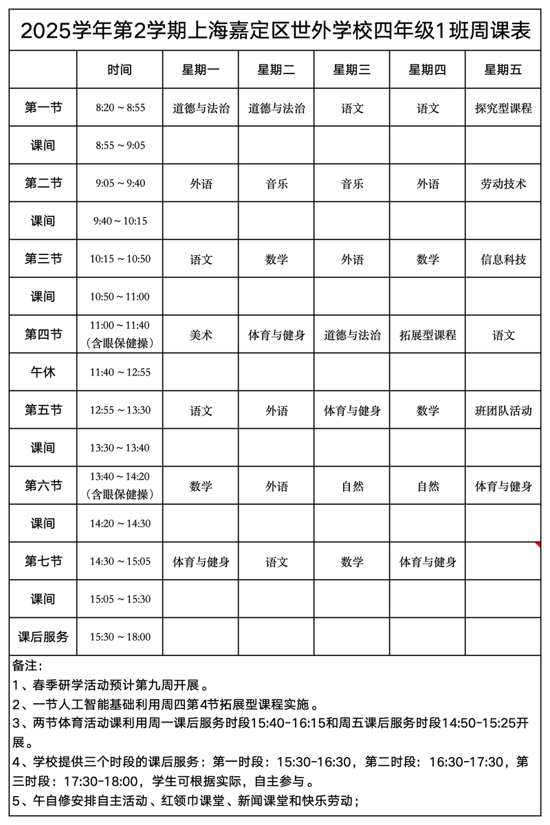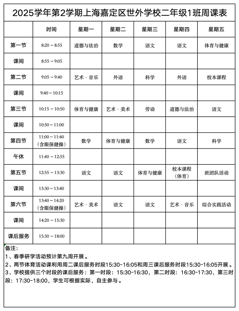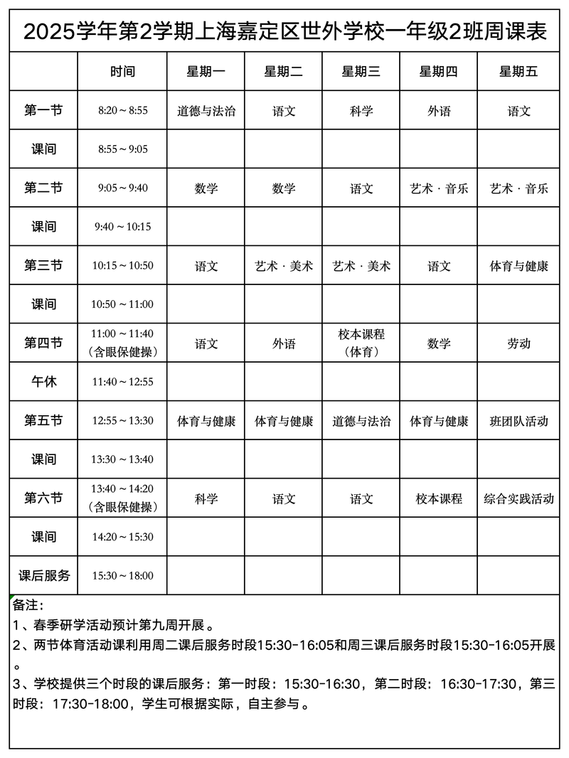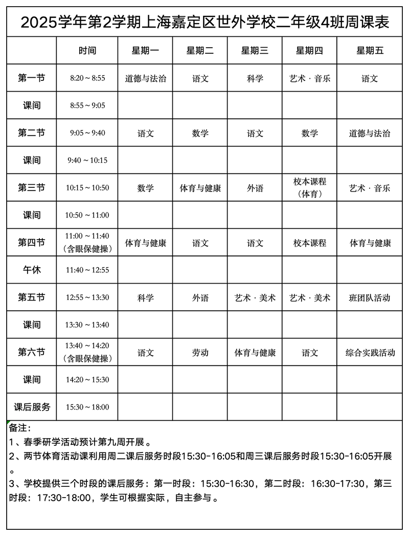 上海嘉定区世外学校晒课表