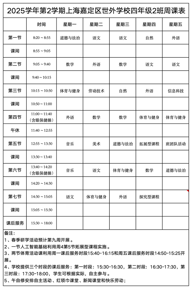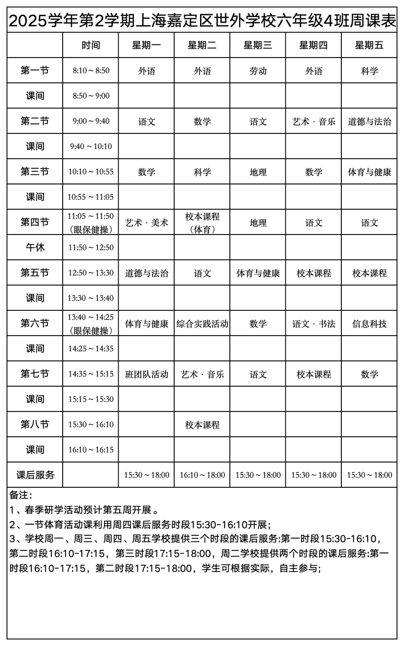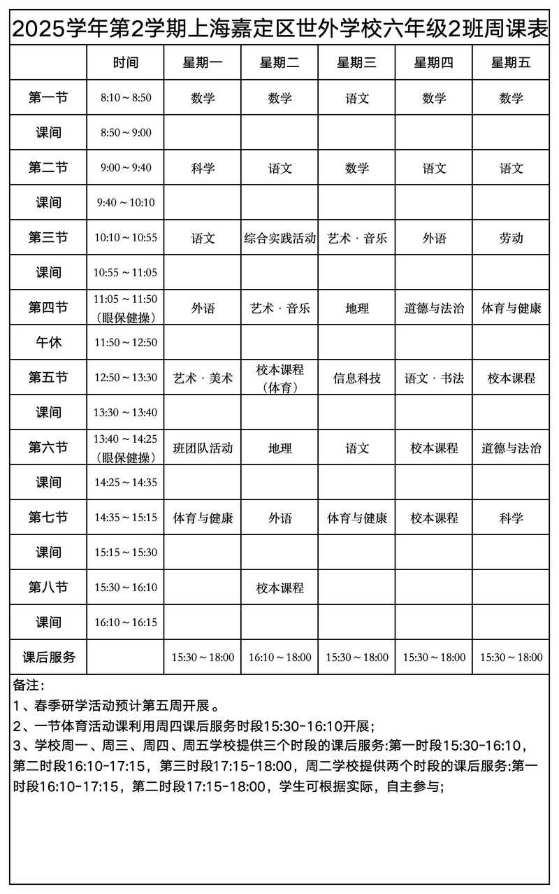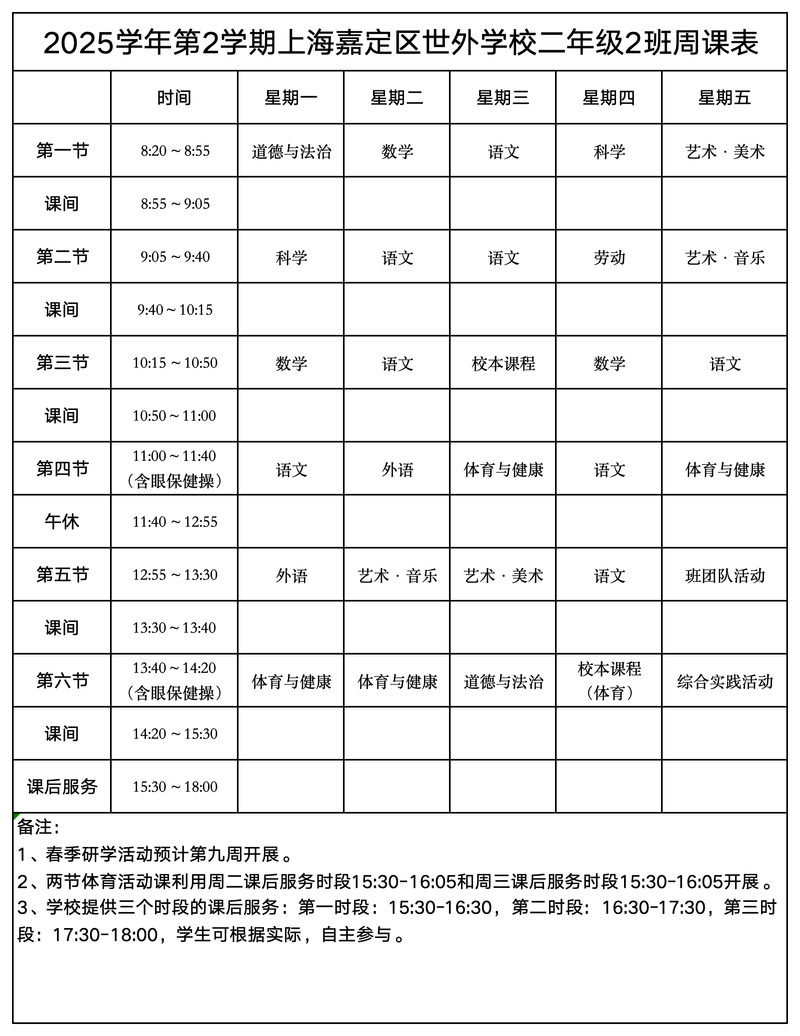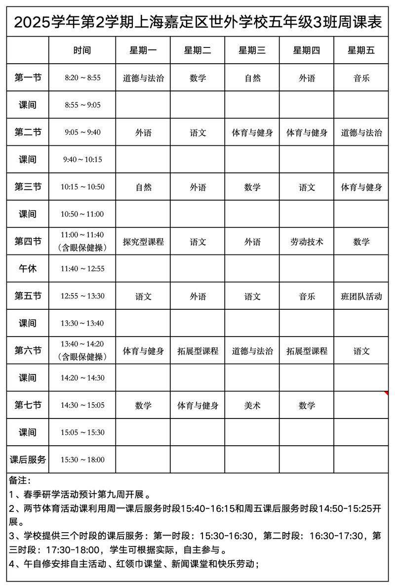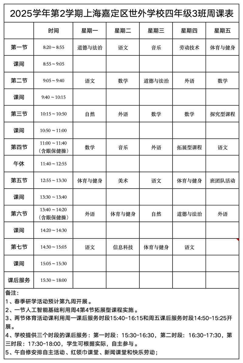 上海嘉定区世外学校晒课表