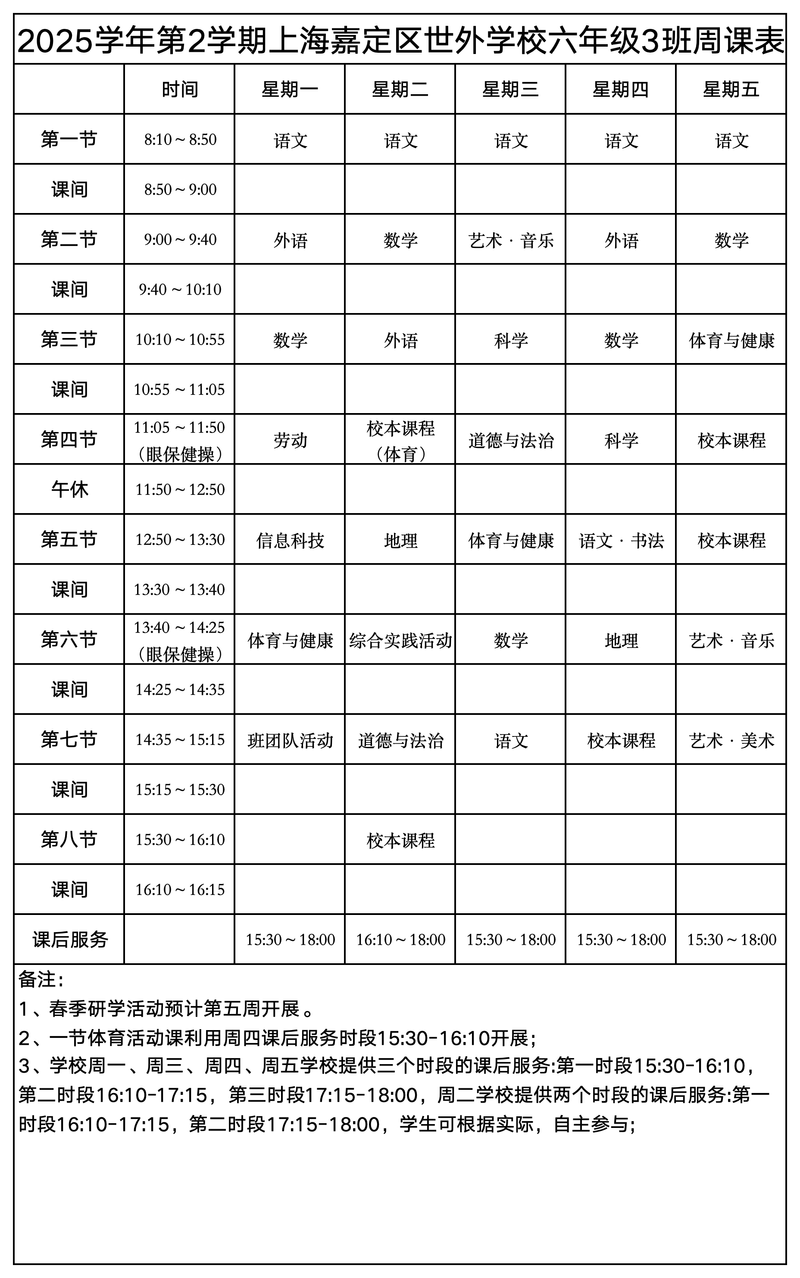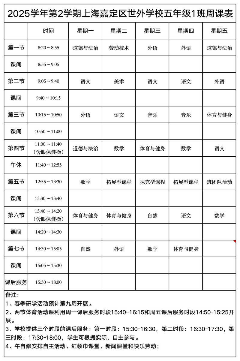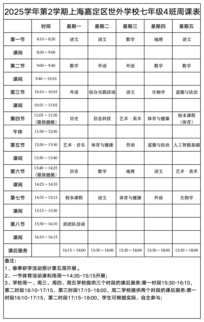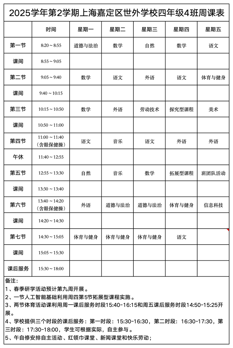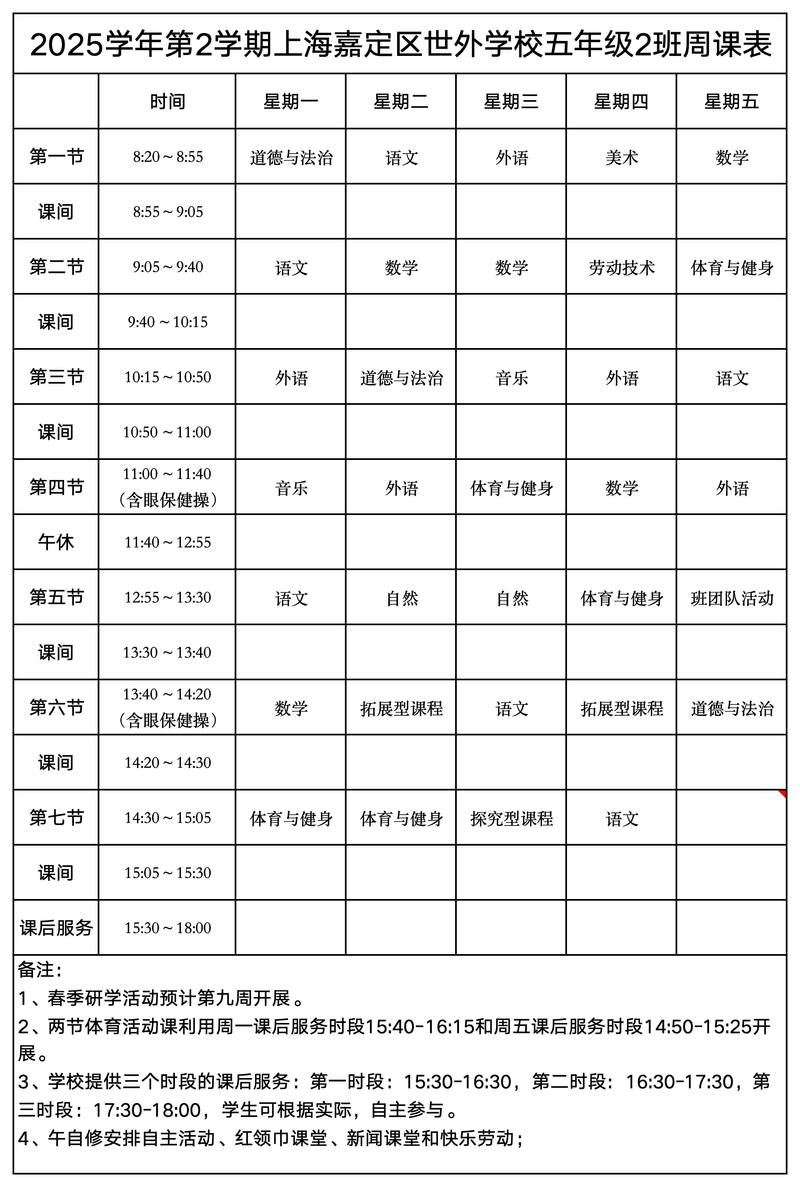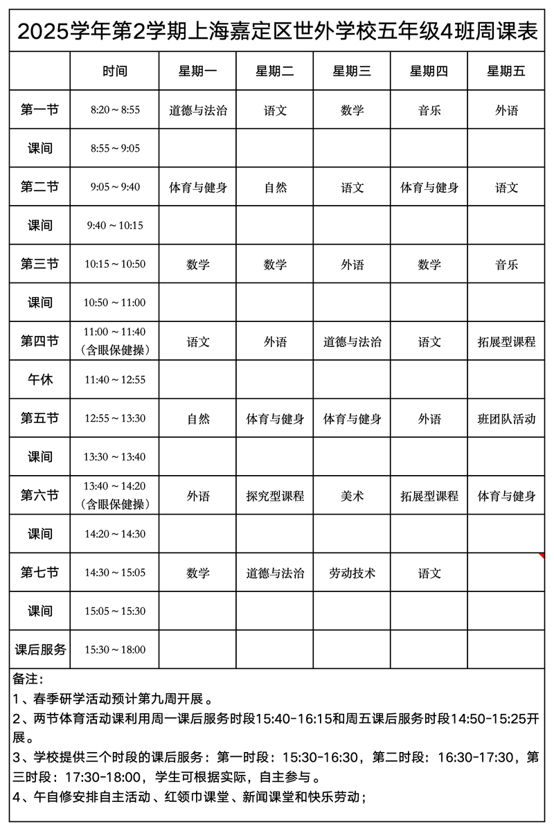 上海嘉定区世外学校晒课表