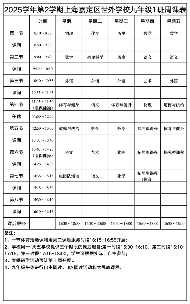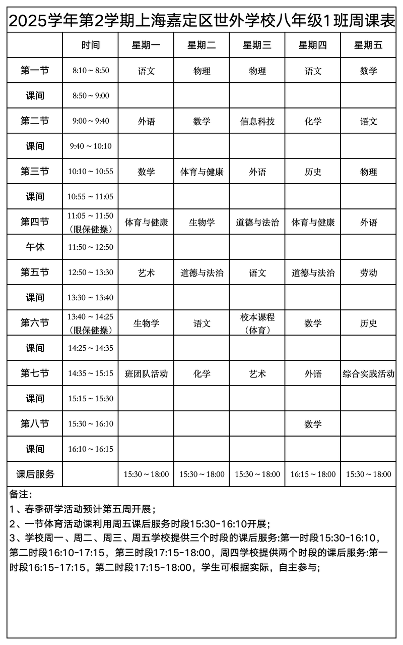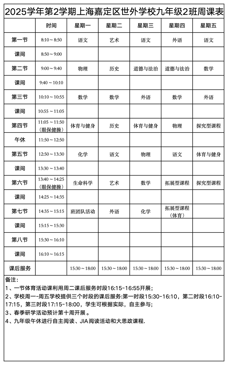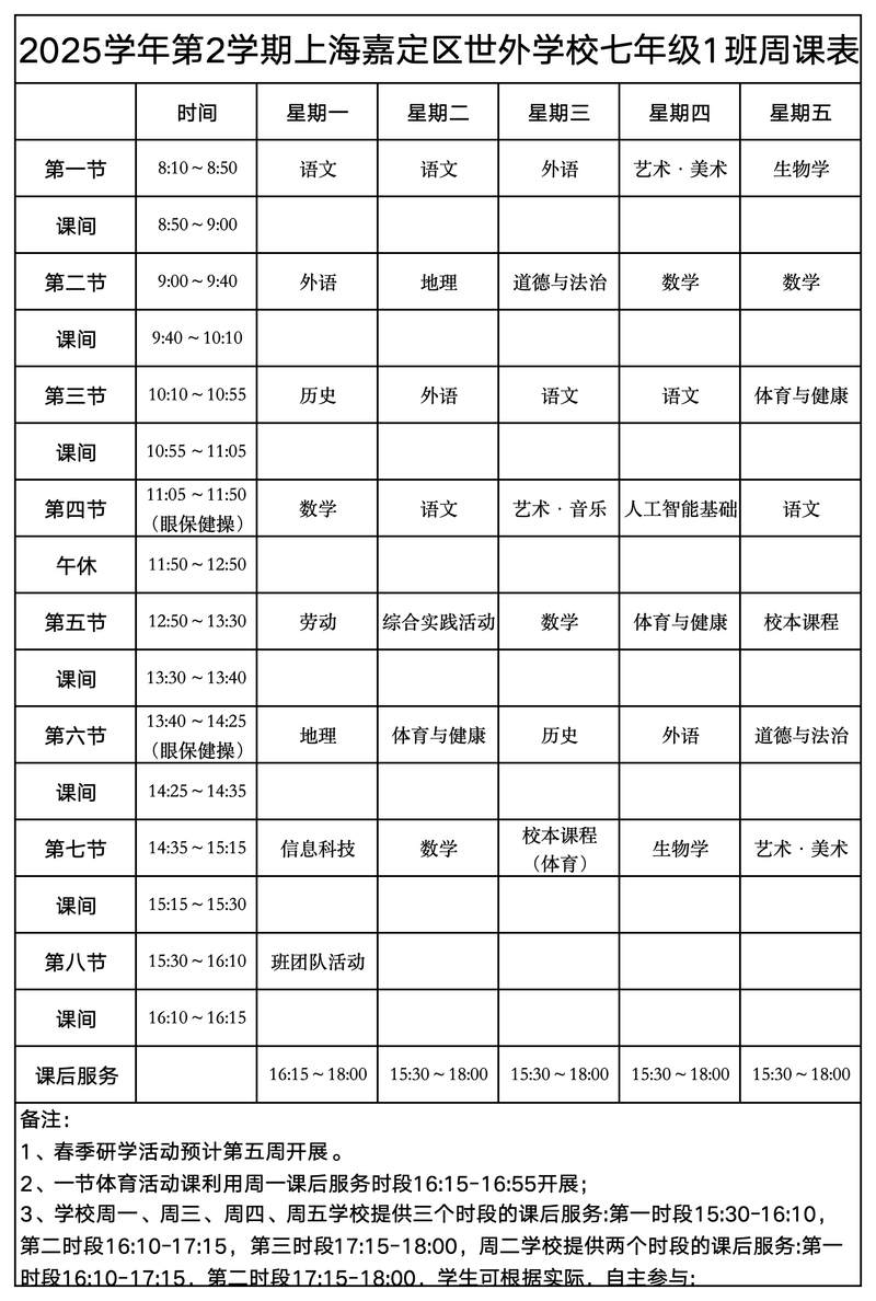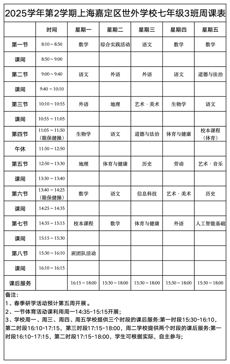 上海嘉定区世外学校晒课表