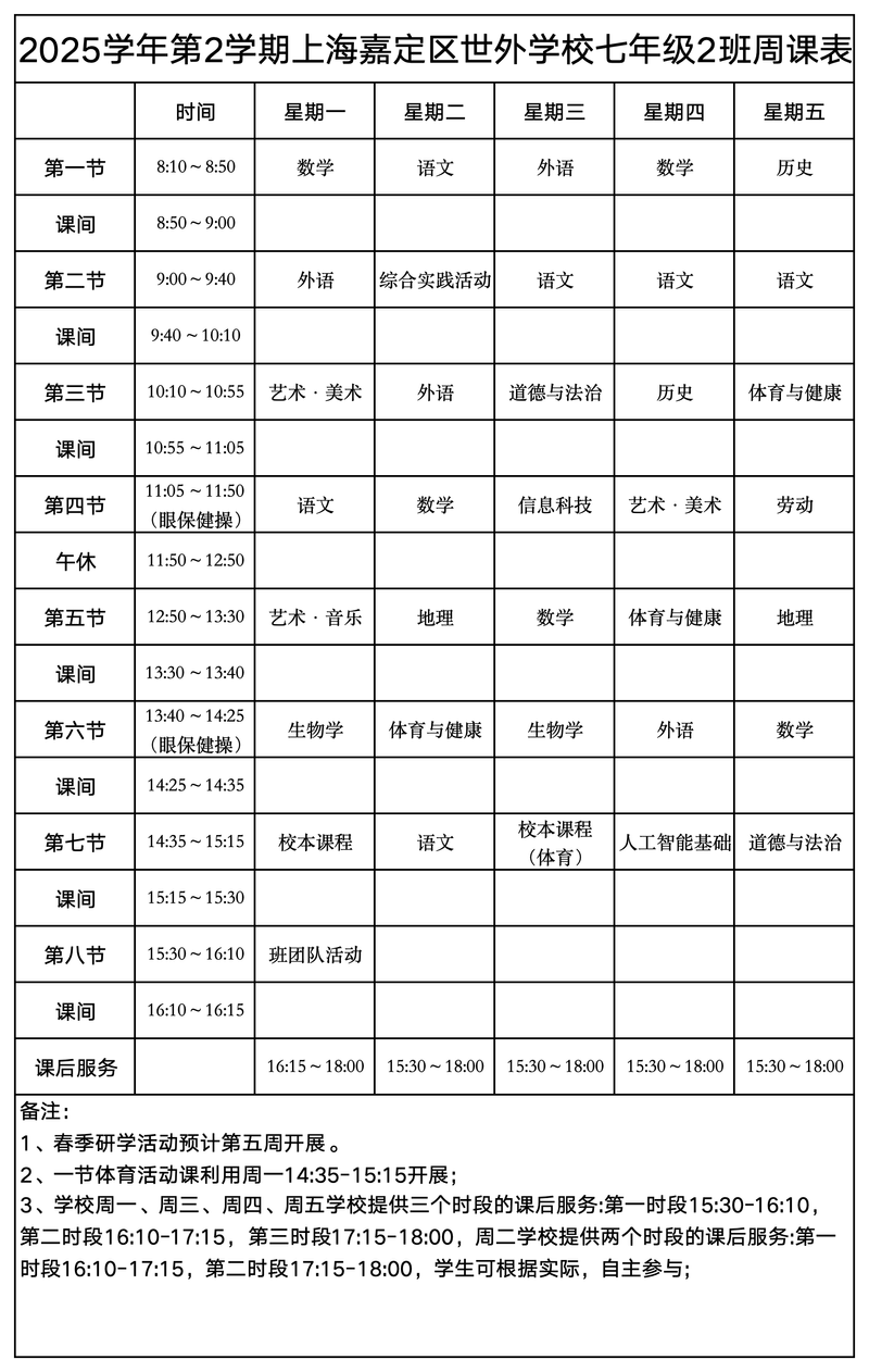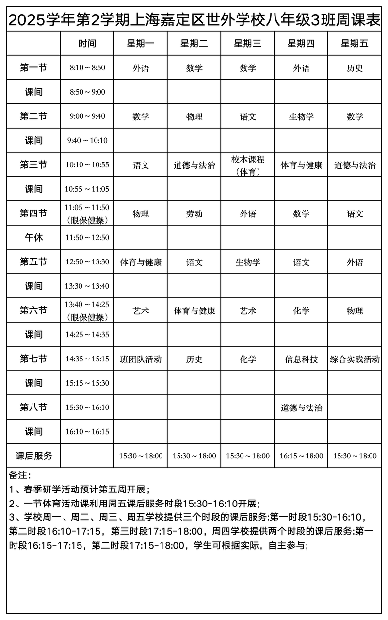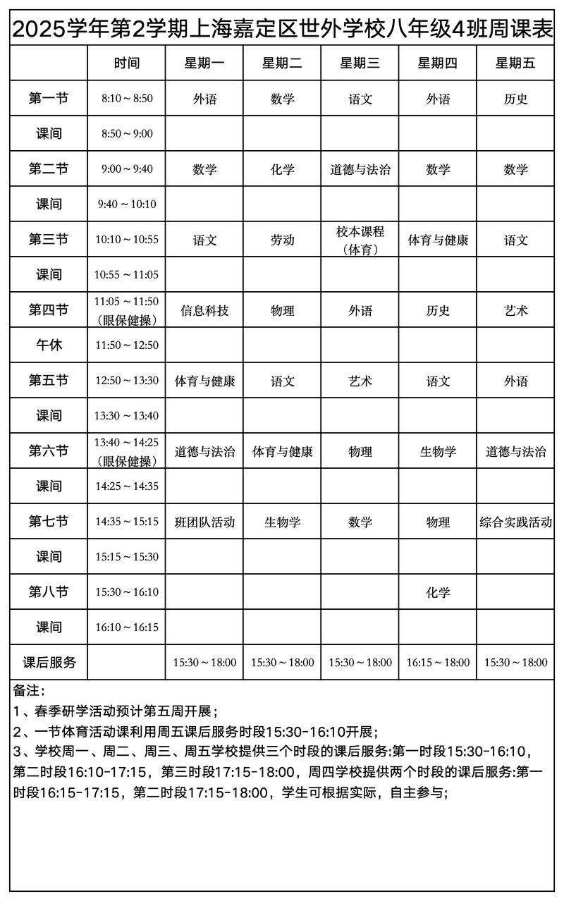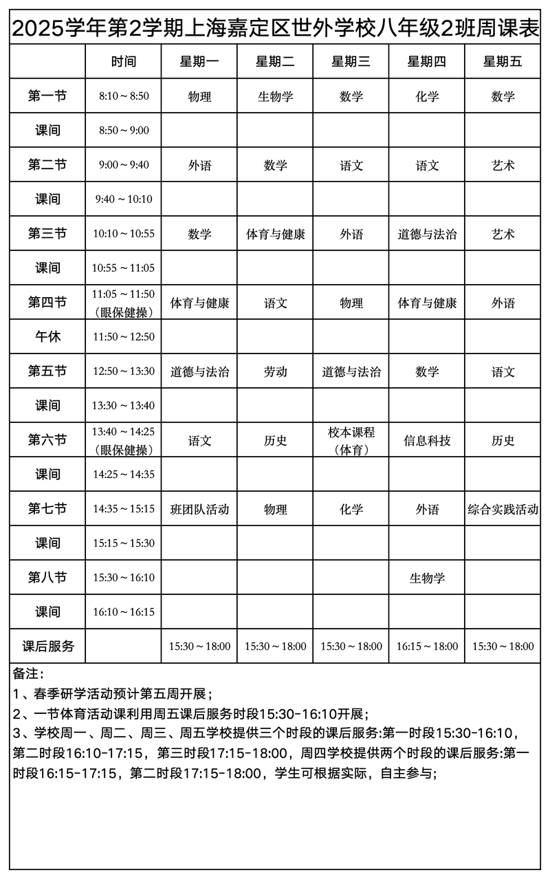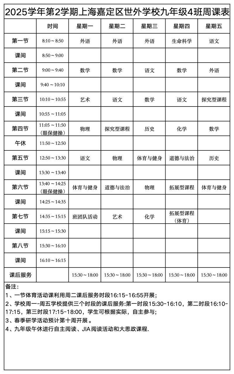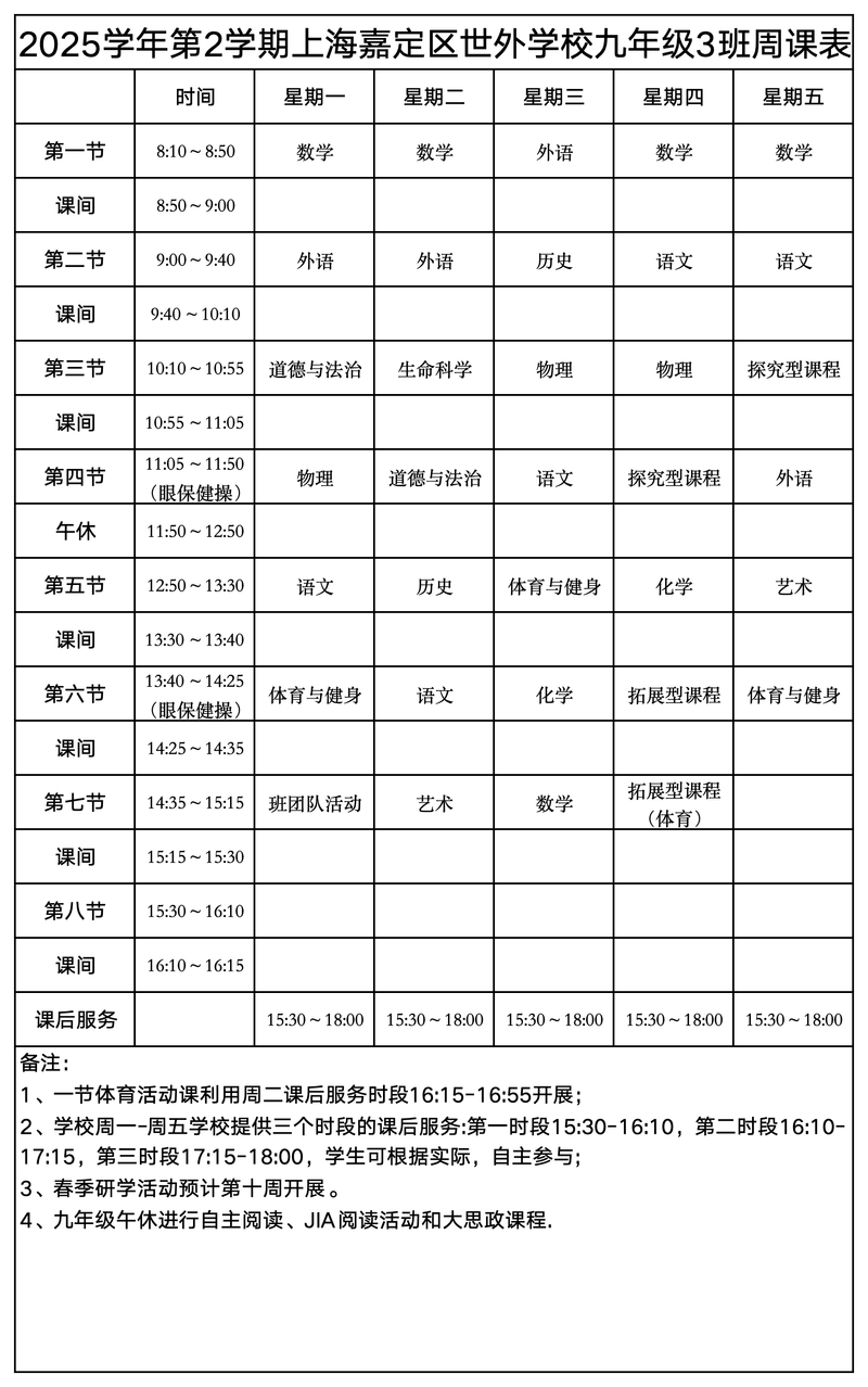 上海嘉定区世外学校晒课表